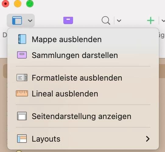 - Der Binder auf der linken Seite - dieser (und die Sammlungen) können ein- oder ausgeblendet werden. Klicke auf das Symbol "Ansicht", um die Optionen anzuzeigen. Je nachdem, was gerade angezeigt wird, wechseln die beiden oberen Optionen zwischen Ein- und Ausblenden. (Beachte auch die Option für die Seitenansicht, auf die später noch eingegangen wird).