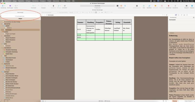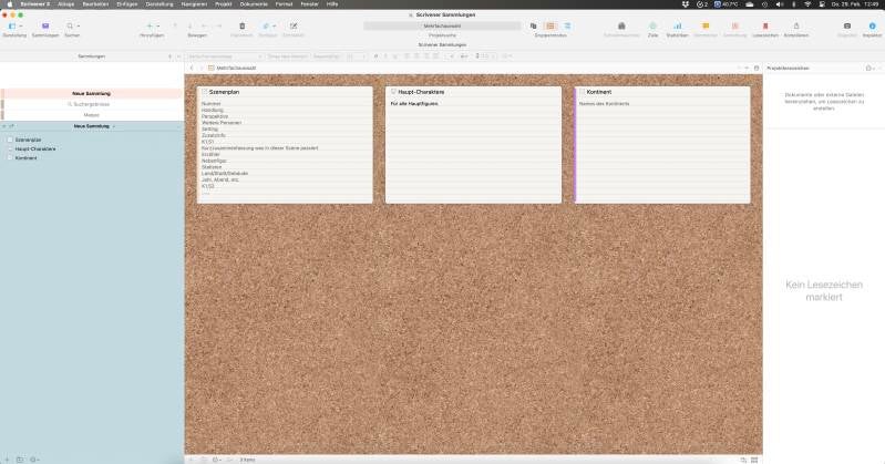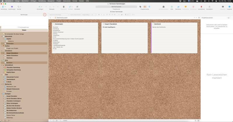 Standardsammlungen sind Sammlungen, die du manuell erstellst und verwaltest, indem du Dokumente deiner Wahl hinzufügst oder entfernst. In meinem aktuellen Projekt habe ich zum Beispiel eine Standardsammlung mit der Liste der Charaktere, der Liste der Einstellungen, der Liste der Szenen und meiner Zusammenfassung der Handlung erstellt, so dass ich leicht auf diese Referenzdokumente zugreifen kann.