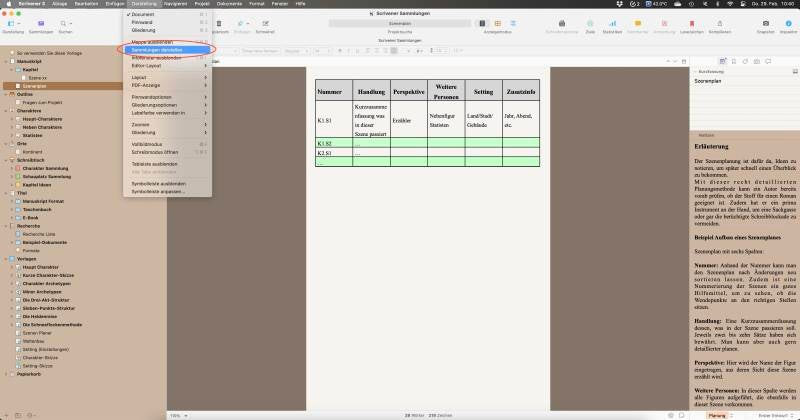 Gehen Sie zu Darstellung → Sammlungen darstellen, um die Scrivener-Sammlungen anzuzeigen.