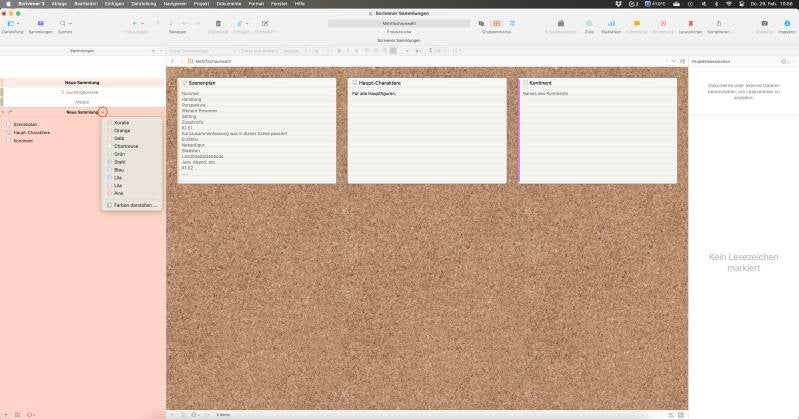 Wenn du auf einen Sammlungsreiter klickst, um ihn zur aktiven Ansicht zu machen, ändert sich die Farbe des Binders entsprechend der Farbe des Sammlungsreiters. Scrivener stellt standardmäßig eine Farbe für jede Sammlung ein, aber diese Farbe kann leicht geändert werden. Um die Farbe der Sammlung zu ändern, klicke auf den Dropdown-Pfeil neben dem Titel der Sammlung. Die Standardfarbauswahl wird angezeigt, oder du kannst unten auf die Option "Farben anzeigen" klicken, um alle Farboptionen anzuzeigen.